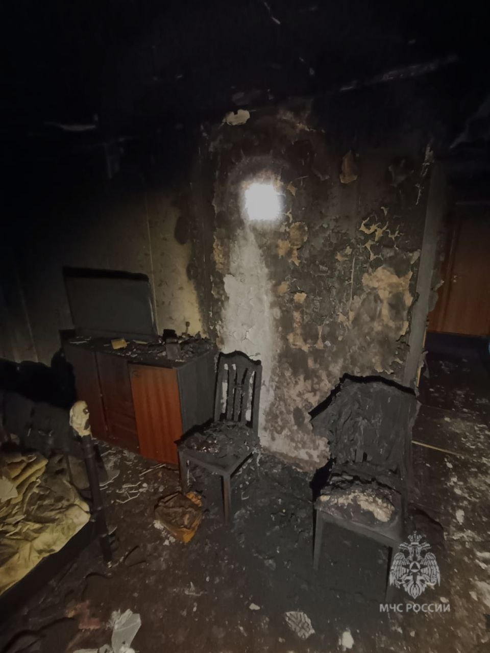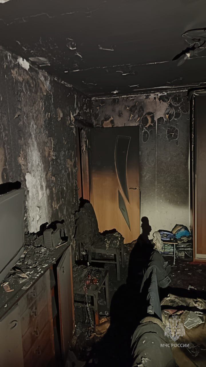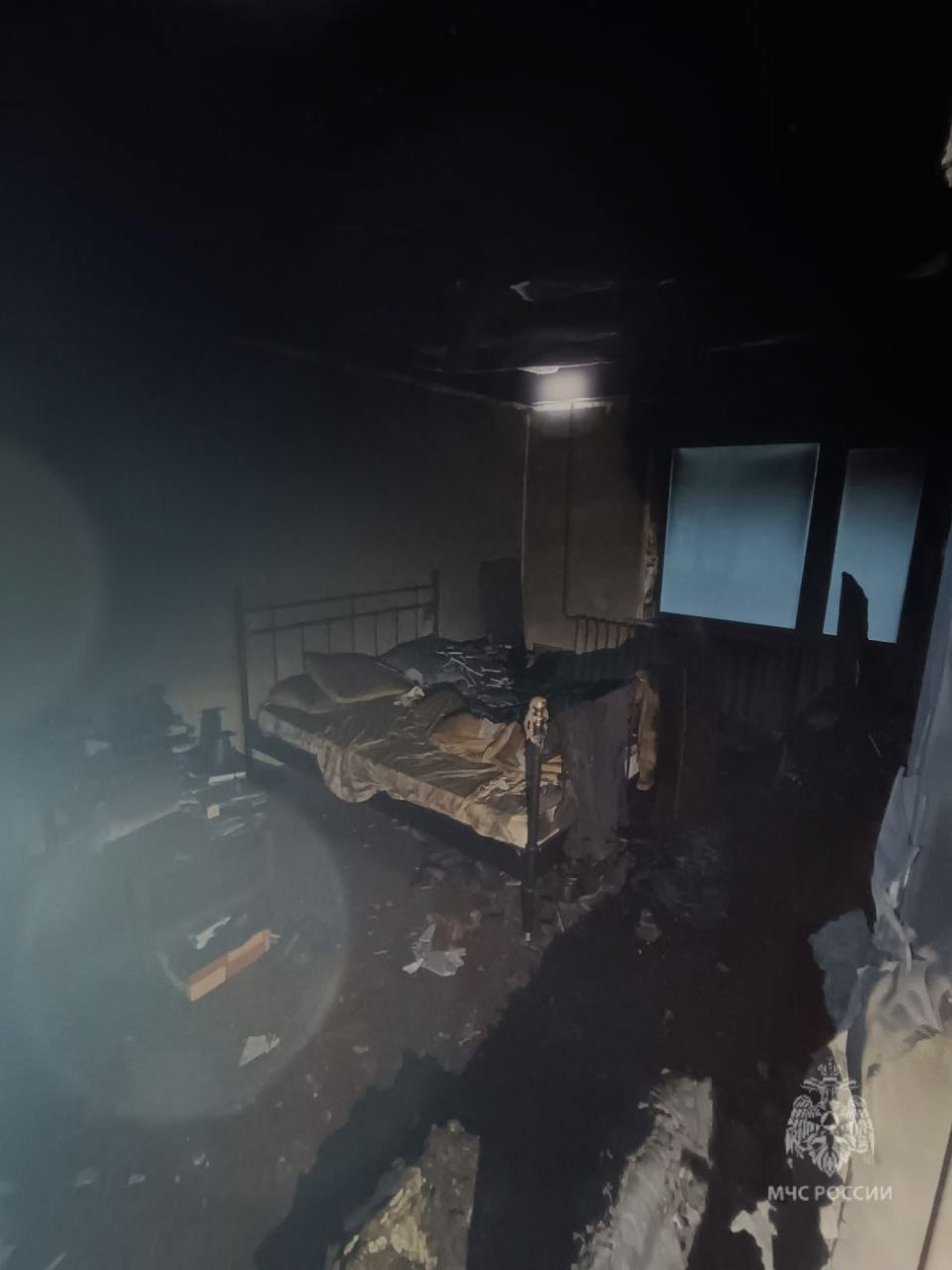 По прибытии пожарных подразделений обнаружены следы горения в спальной комнате двухкомнатной квартире на первом этаже девятиэтажного жилого дома. Герметичность помещения с пластиковыми окнами, не пропускающими воздух, привела к самозатуханию пожара. Тело погибшего обнаружено в