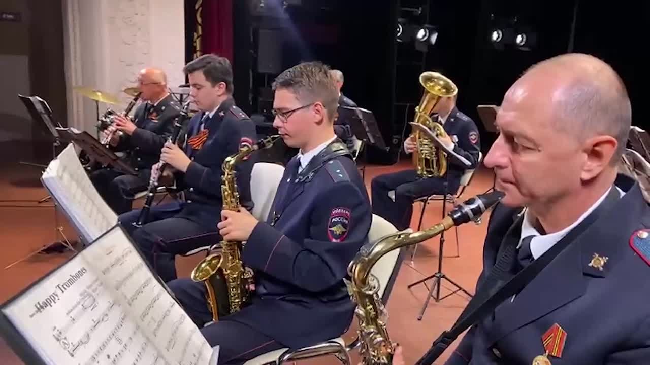 18 сотрудников полиции, а в состав оркестра входят 4 трубача, 3 тромбониста, 2 саксофониста, 2 кларнетиста, ударник, вокалист, а также музыканты, играющие на тубе, баритон тубе порадовали зрителей патриотическими хитами, как советских времен, так и современными.