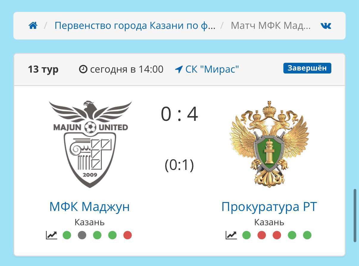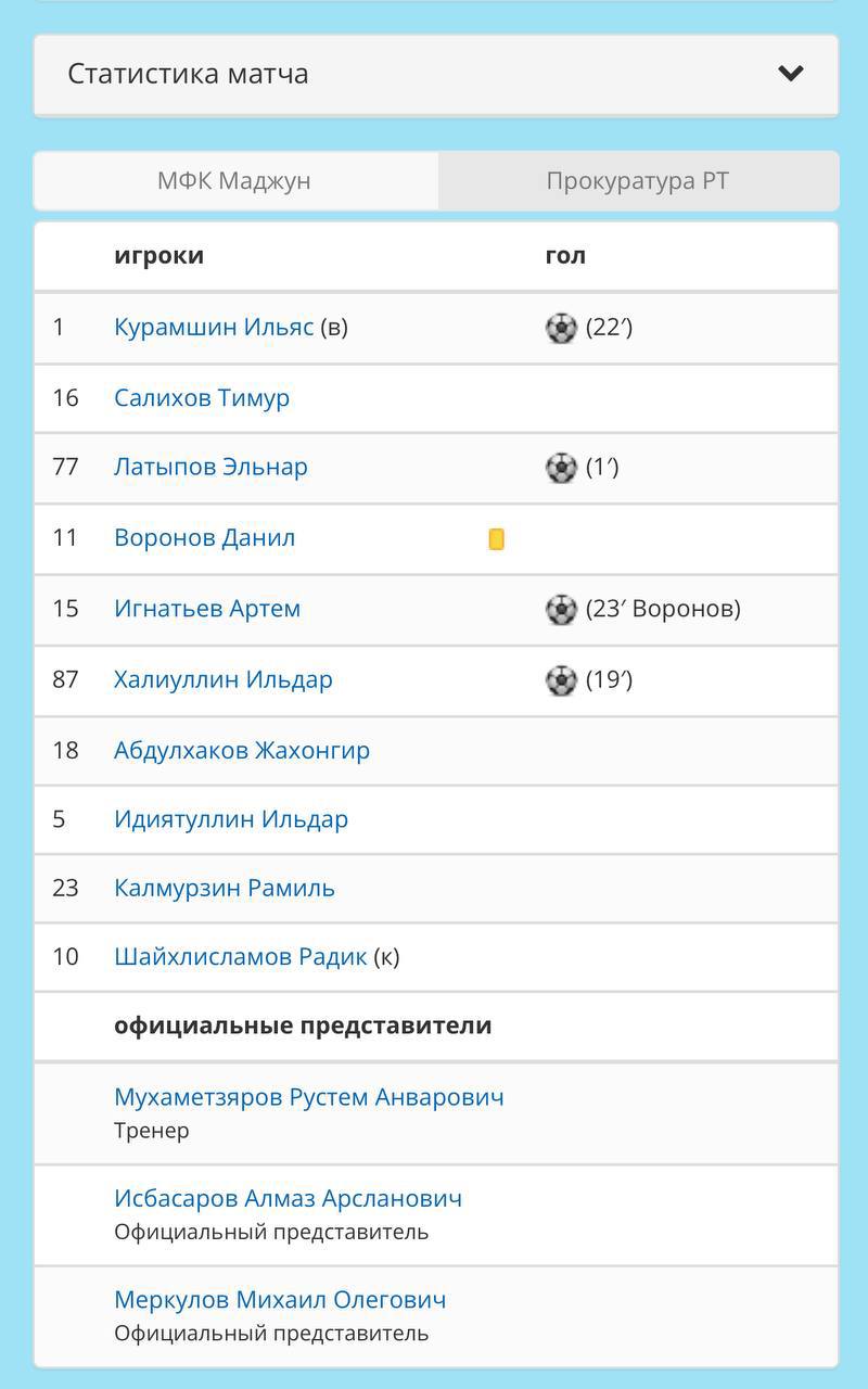 Сборная прокуратуры Татарстана по мини-футболу вновь одержала уверенную победу - на этот раз над командой МФК «Маджун». Игра стала ярким примером мастерства, командной игры и спортивного духа наших ребят. Каждый гол приносил зрителям радость и восторг, а атмосфера на трибунах была незабываемой!