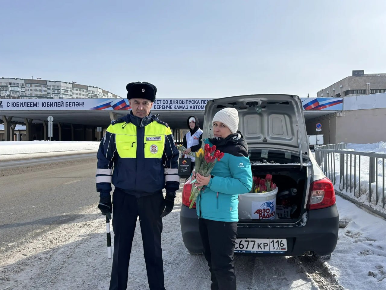 Сотрудники Госавтоинспекции УМВД России по г. Набережные Челны поздравили автоледи с праздником. Они на проспектах города останавливали автоледи и вручали им весенние букеты.