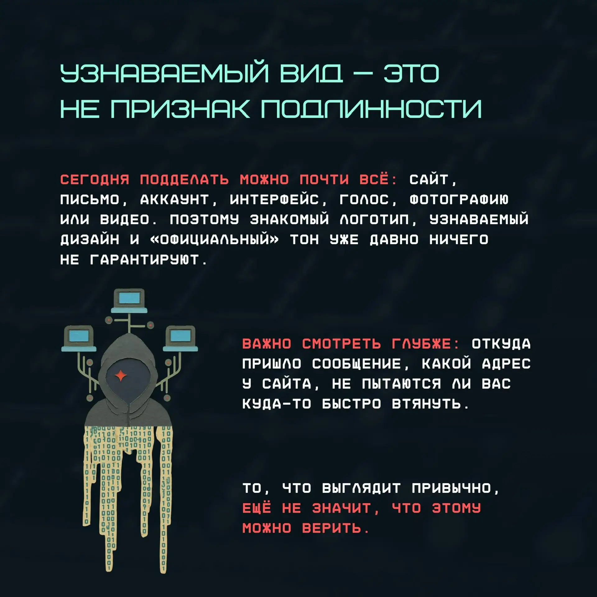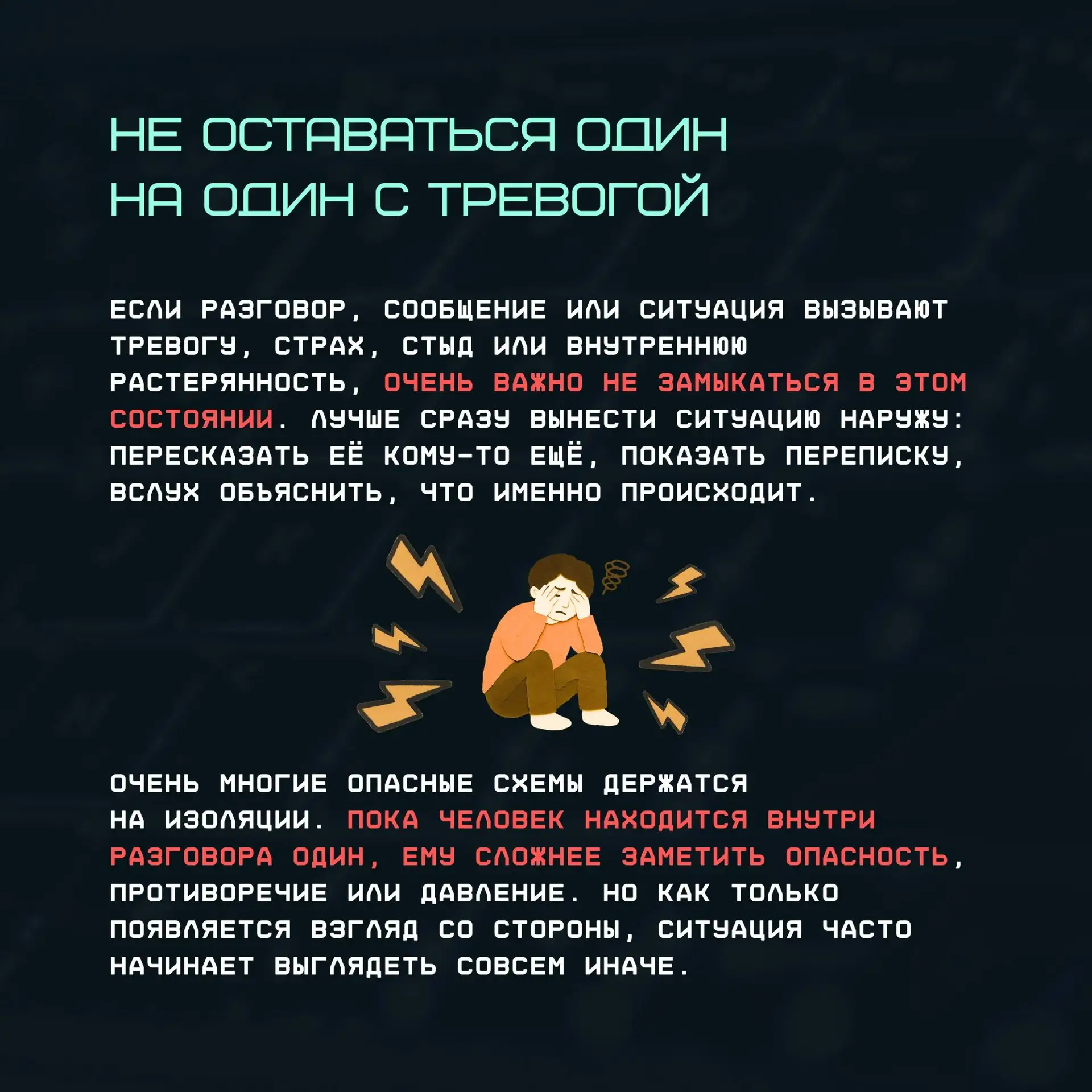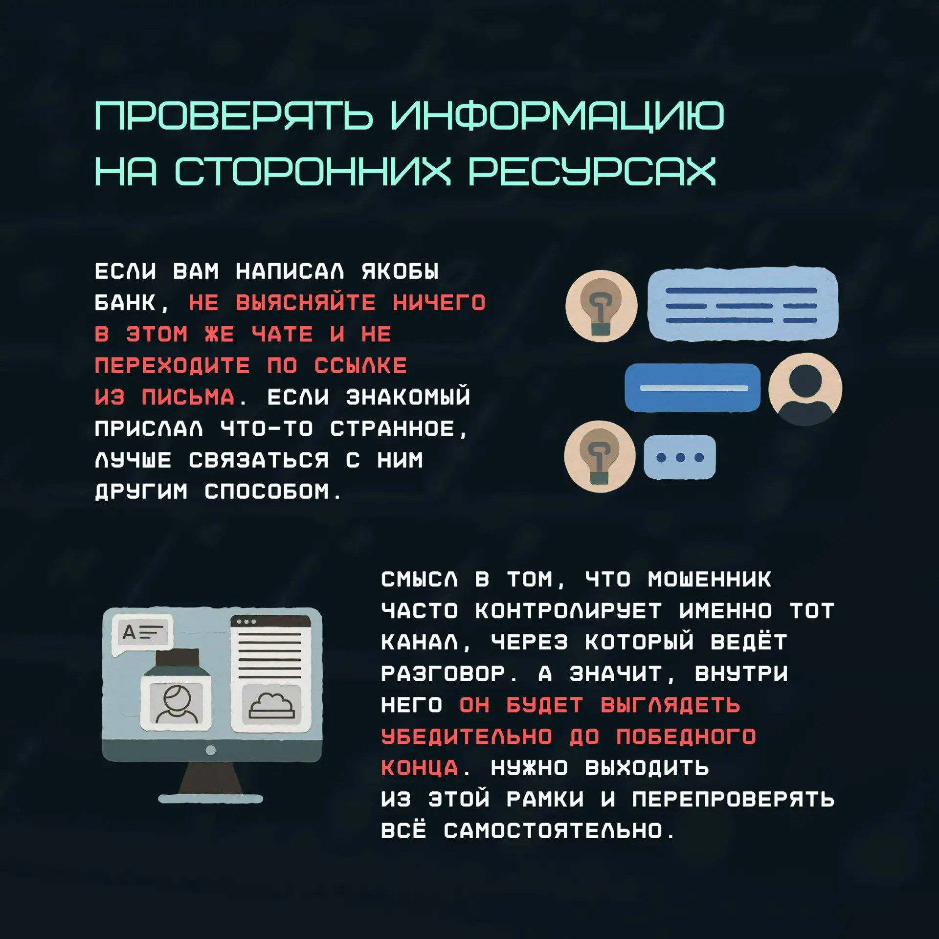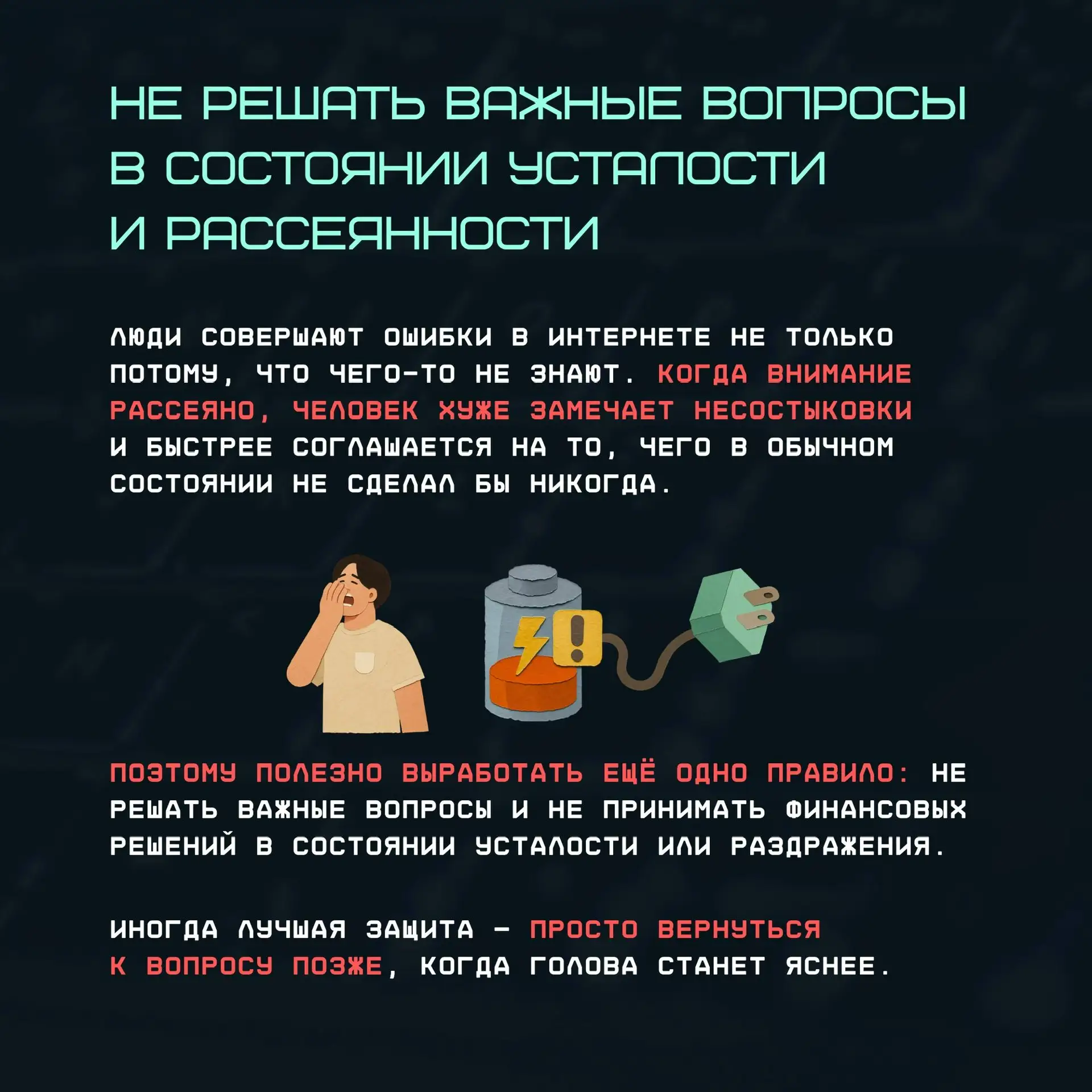 Часто мошенники используют не сложные технологии, а человеческую психологию — спешку, доверие, усталость и другие эмоциональные состояния. Именно поэтому защита предполагает не только программу-антивирус или двухфакторную аутентификацию, но и привычки, которые помогают вовремя остановиться, перепроверить информацию и сохранить контроль над ситуацией.