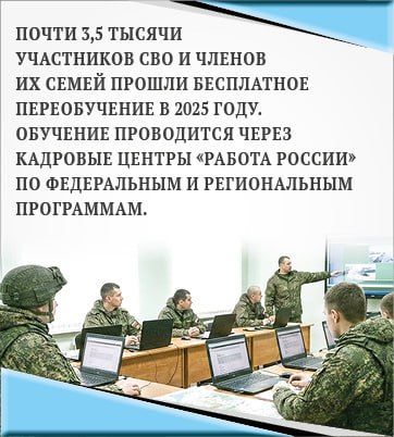 Почти 3,5 тыс. участников СВО и членов их семей в 2025 году прошли бесплатное переобучение через кадровые центры «Работа России» по...