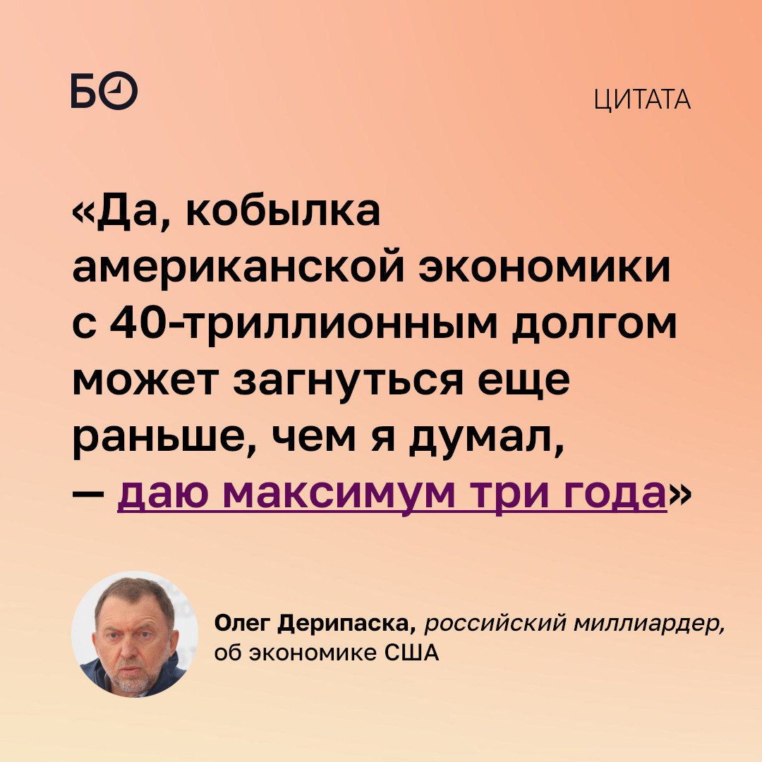 Американская экономика с долгом почти в $40 трлн продержится максимум три года. Так Олег Дерипаска отреагировал на заявление Дональда Трампа о том, что Вашингтон выделит более $1 трлн на оборону в 2026 году.