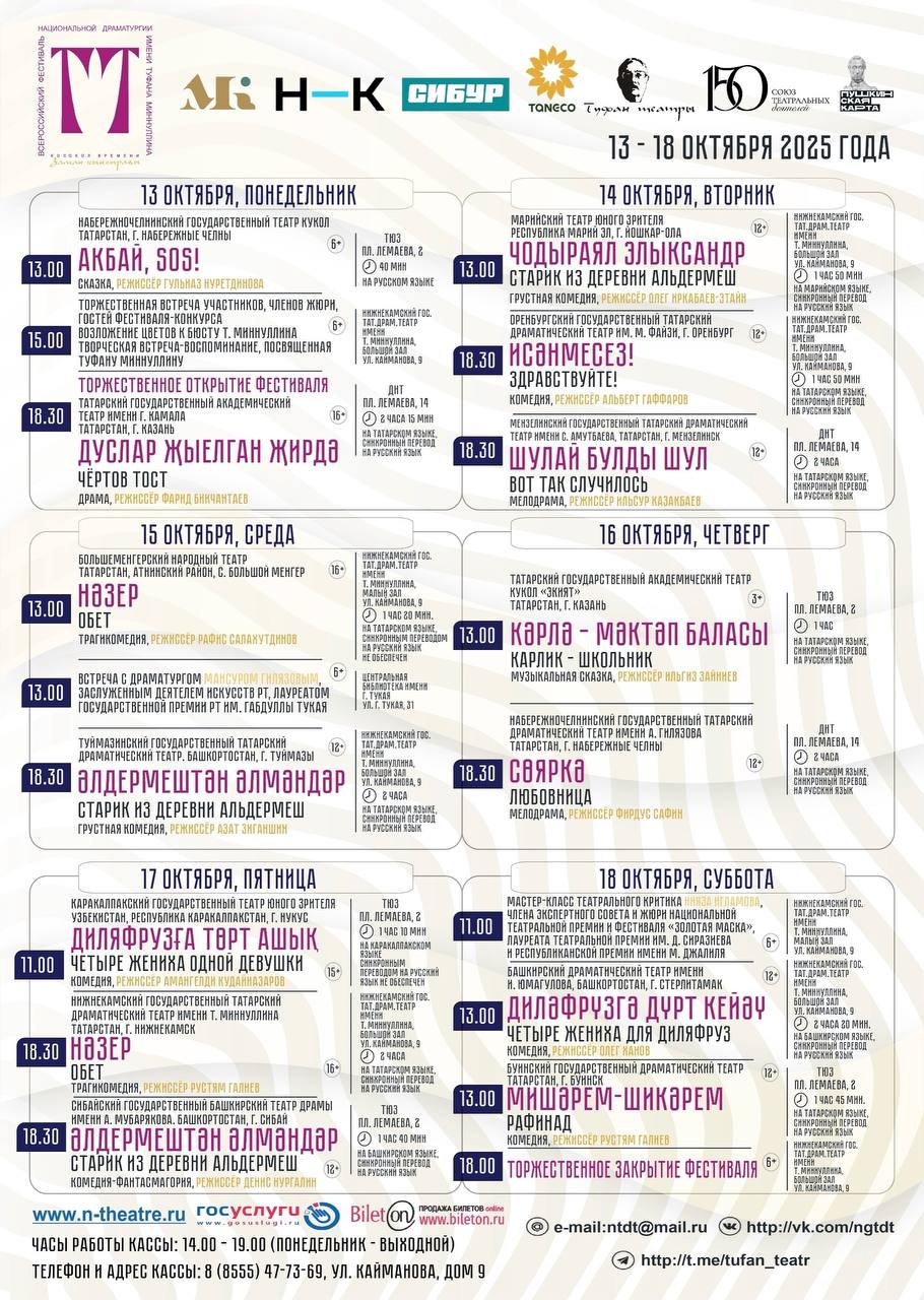 Представления пройдут на трех главных сценах города: в Нижнекамском Татарском драматическом театре им. Т. Миннуллина, Доме народного творчества и Театре юного зрителя. Зрители смогут насладиться постановками по пьесам Туфана Миннуллина на татарском, башкирском, русском, марийском и каракалпакском языках.