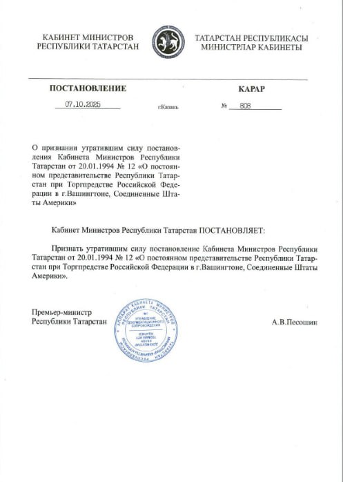 Там добавили, что в середине июля кабмин РТ утвердил новые положения о деятельности торгово-экономических представителей, поэтому действующие нормативные акты привели в соответствие с ними.
