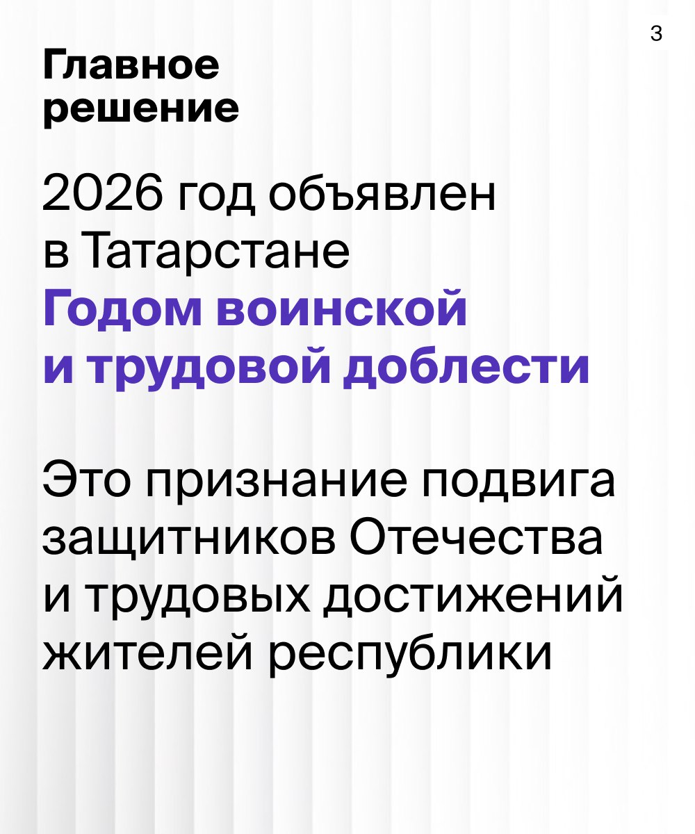 Темой дня стало Ежегодное послание Раиса Татарстана Госсовету РТ. В своём выступлении Рустам Минниханов объявил 2026 год в Татарстане Годом воинской и трудовой доблести. Ключевые тезисы с выступления Раиса Татарстана - в наших карточках.