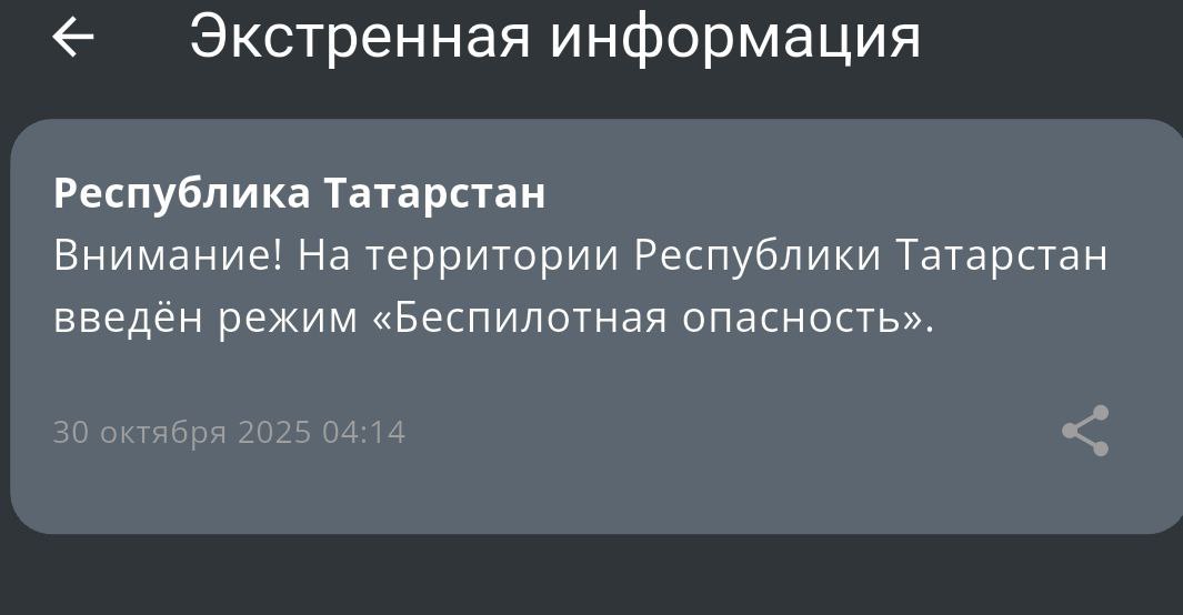 В Татарстане с 4:14 утра введён режим беспилотной опасности. Уведомление об этом поступило через приложение МЧС России.
