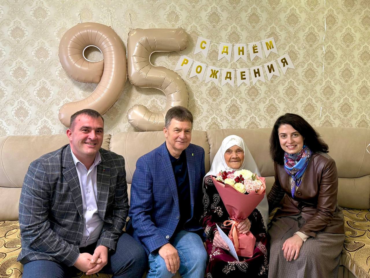 Заместитель мэра Нижнекамска Марина Камелина и заместитель руководителя Исполкома НМР по сельскому хозяйству Альфред Нигматзянов посетили село Кулмакса, чтобы лично поздравить с 95-летним юбилеем Исламию Минниханову.
