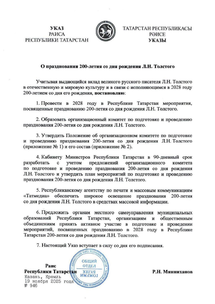 В 2028 году в Татарстане отметят 200-летие со дня рождения великого писателя Льва Толстого