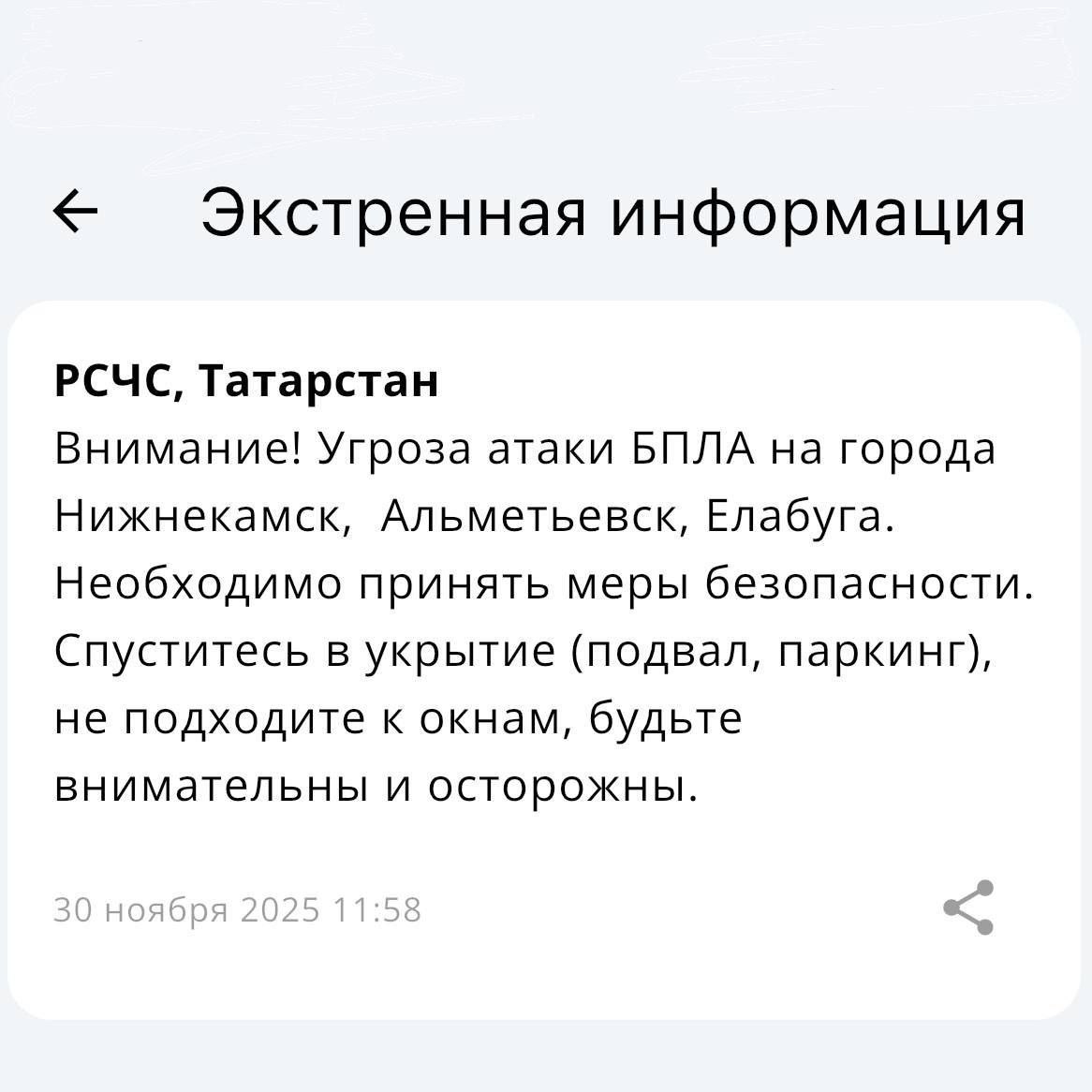 - Дорогие нижнекамцы, соблюдайте меры безопасности! МЧС объявило угрозу атаки БПЛА на Нижнекамск. Для аэропорта также введены временные ограничения на прием и выпуск воздушных судов.// Радмир Беляев. Менделеевск