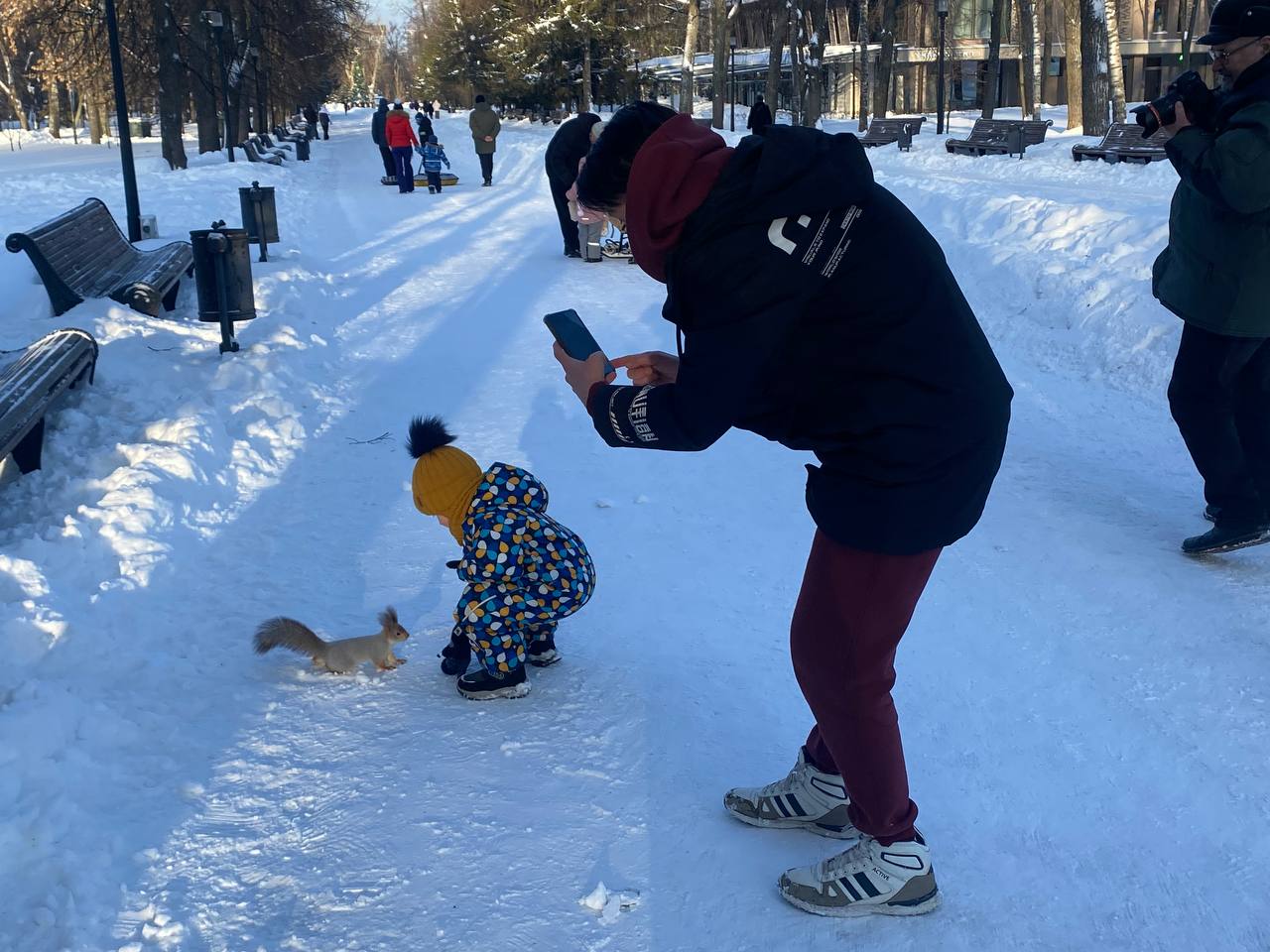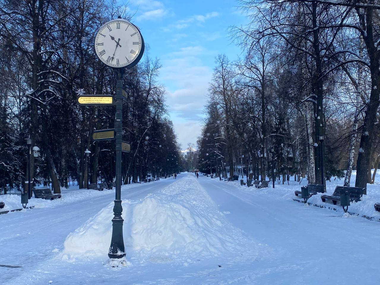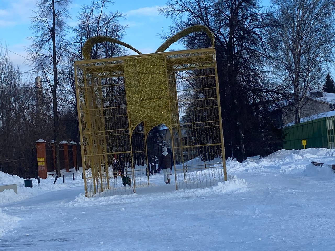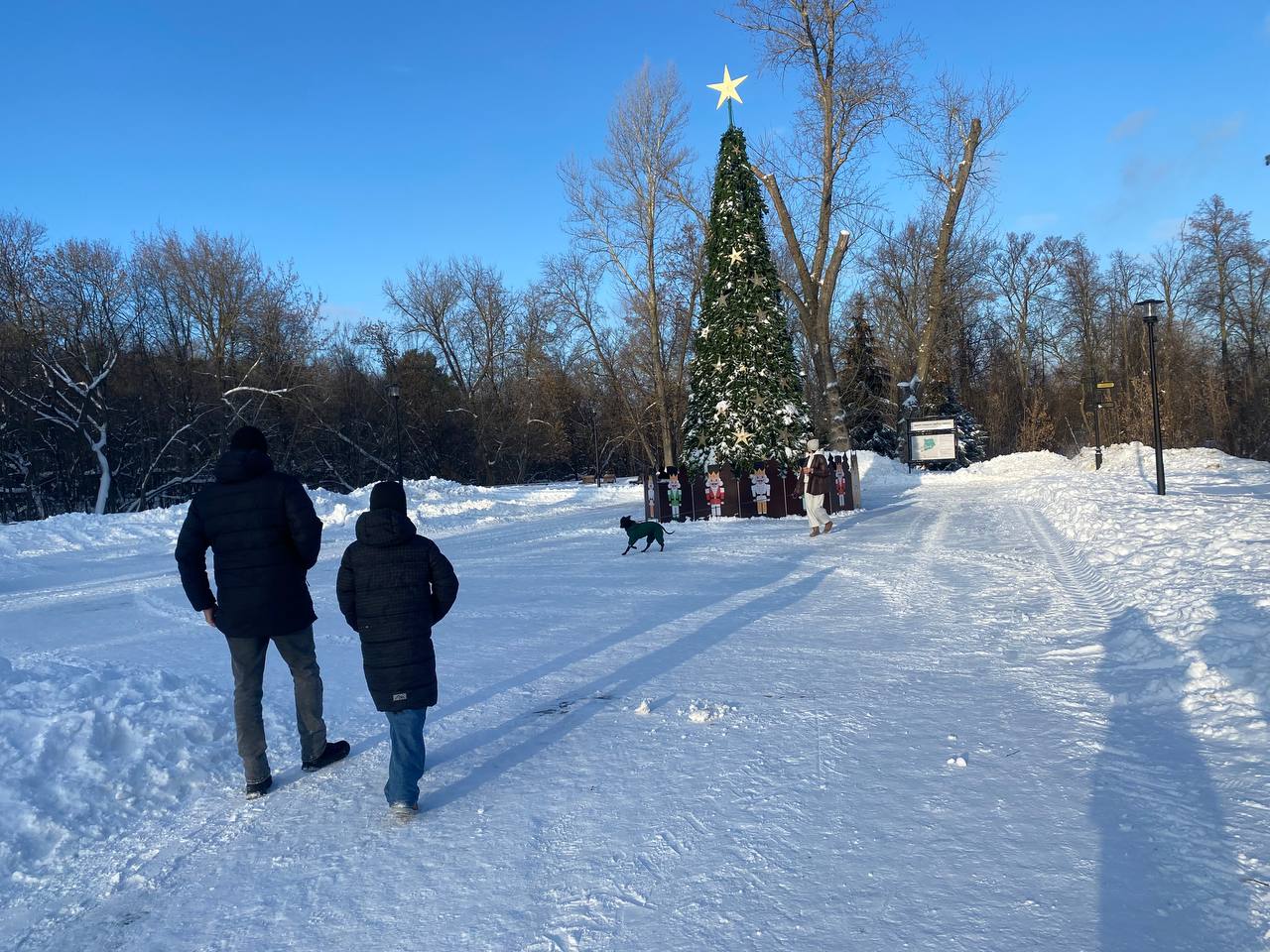 В парке им. Горького нас встречает огромная шишка. Может, потому что здесь много белочек? Днём в парке много лыжников и детишек с родителями, ведь тут большая горка. Не ленятся отдыхающие дойти и до елочки. Она прекрасна в любое время суток.