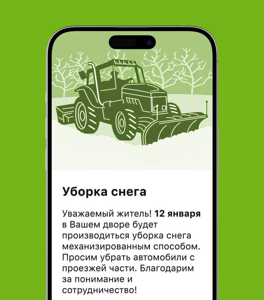 Жители УК «Эйбэт», установившие мобильное приложение «Эйбэт», получают pushуведомления с актуальной информацией об уборке снега во дворах. Это удобный способ заранее узнать о работах и быть в курсе изменений в реальном времени.