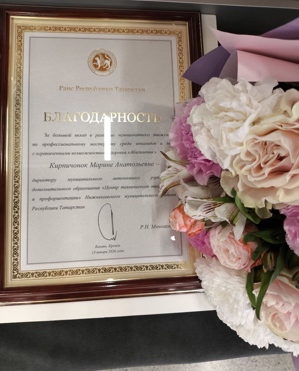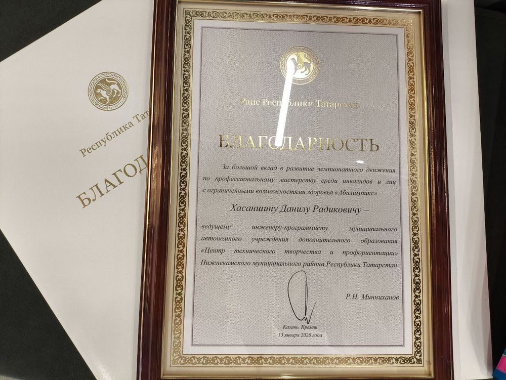 Нижнекамск на встрече представляла делегация из более чем 30 участников. Наши земляки получили две награды. Рустам Минниханов вручил Благодарности за большой вклад в развитие движения «Абилимпикс» директору «Центра технического творчества и профориентации» Марине Кирпичонок и ведущему инженеру-программисту центра Данилу Хасаншину. Он сам, ещё будучи школьником и студентом, участвовал в «Абилимпиксе», а теперь готовит новых чемпионов.