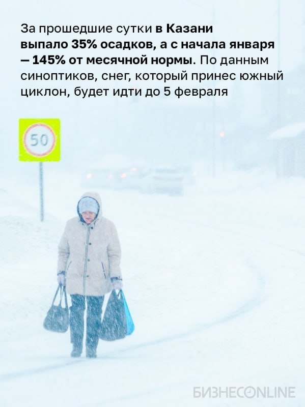 Пускай еще навалит так, чтобы все дома сидели и кайфовали! Зима должна быть зимой, заявил один из казанских таксистов, комментируя снегопад, который накрывает Татарстан и ее столицу уже третий день. И он, по словам синоптиков, еще далеко не закончился. Предварительно, снег, который принес южный циклон, будет идти до 5 февраля, причем в начале следующей недели температура рухнет до -25 градусов.