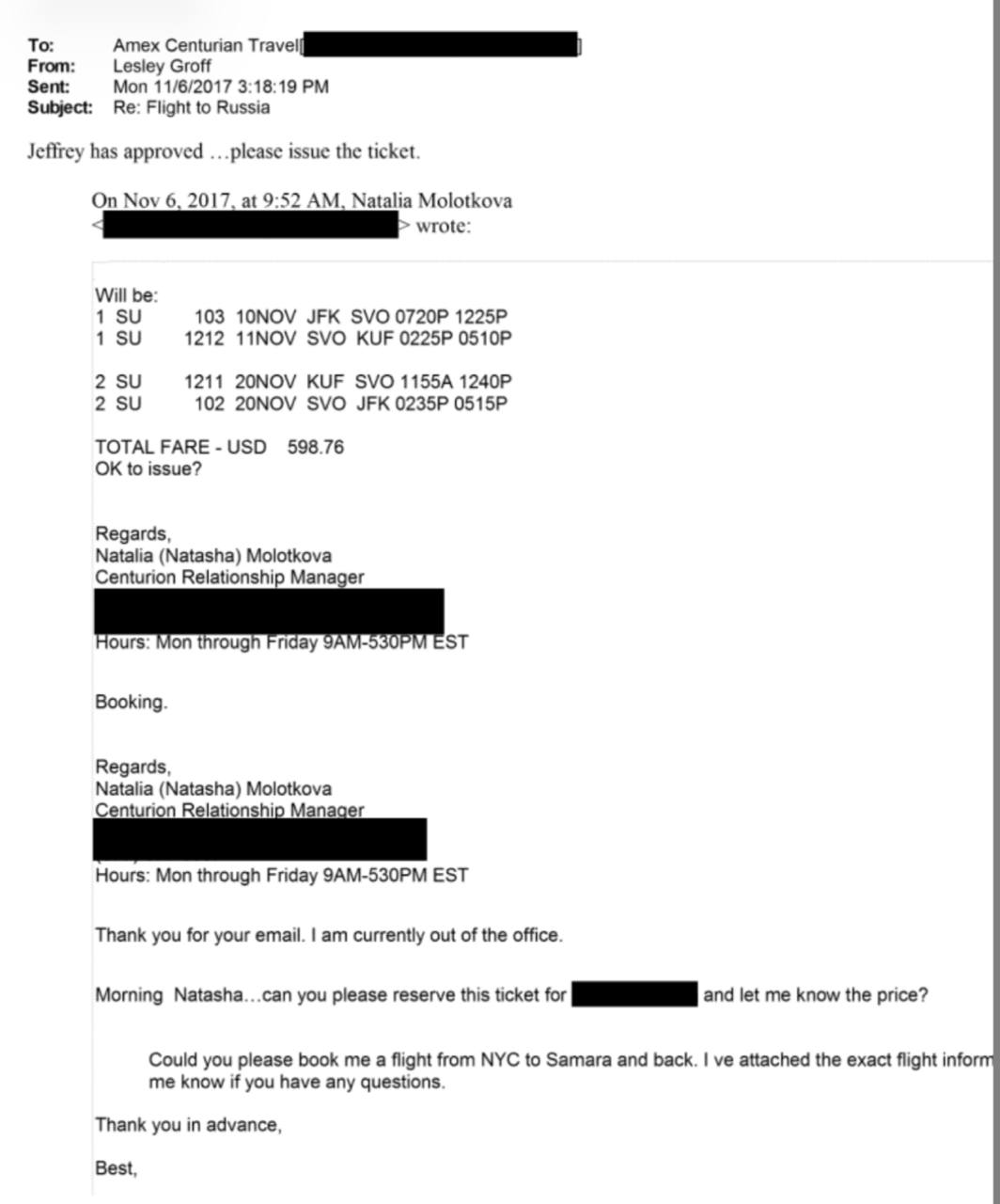 В графике Грофф на 11 сентября 2017 года зафиксирован перелет из Нью-Йорка в Самару рейсом российской авиакомпании. В архиве также обнаружено резюме участницы конкурса «Мисс Тольятти», имеющей отношение к модельному бизнесу для детей. В дополнение к этому, исходя из имеющихся документов, Эпштейн посещал и Казань»
