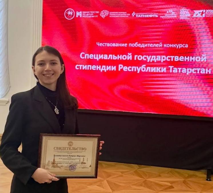 Студентка Нижнекамского филиала КИУ, член клуба молодых избирателей города Катрин Тухватуллина удостоена специальной государственной стипендии Республики Татарстан. Награда присуждена за отличную учёбу, а также победы и призовые места в научнопрактических конференциях и предметных олимпиадах.