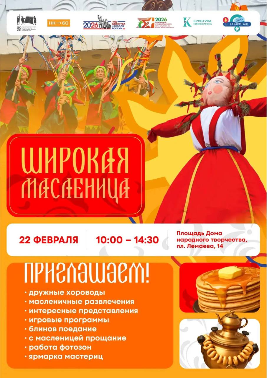 Праздник развернётся на площади у Дома народного творчества — стартуем в 10:00! В программе — красочное театрализованное представление с главным масленичным обрядом — сжиганием чучела, а также большой концерт с участием городских артистов и творческих коллективов.