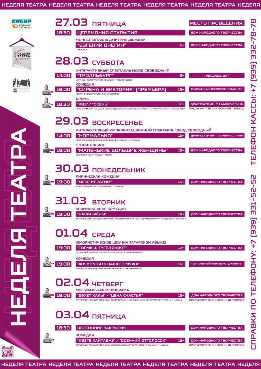 С 27 марта по 3 апреля в городе пройдёт «Неделя театра нефтегазохимических городов России». На сценах — театры из Москвы, Казани, Твери, Альметьевска, Воронежа, Екатеринбурга и Нижнекамска.