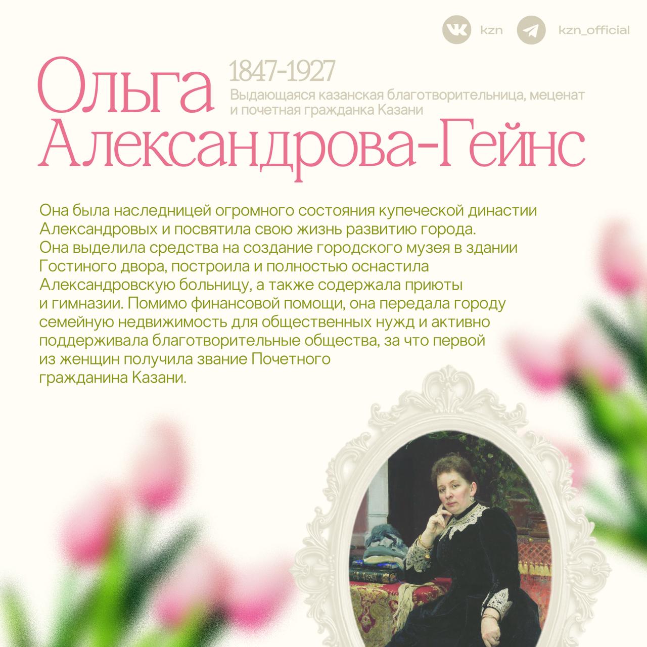 ...написана история нашего города! И каждая из них внесла свой неоценимый вклад в развитие не только Казани, но и целых отраслей. Они участвовали в защите страны, благотворительности и создавали великие произведения. Прекрасных и великих женщин Казани много. Оставляйте в комментариях имена тех, кого считаете важным отметить