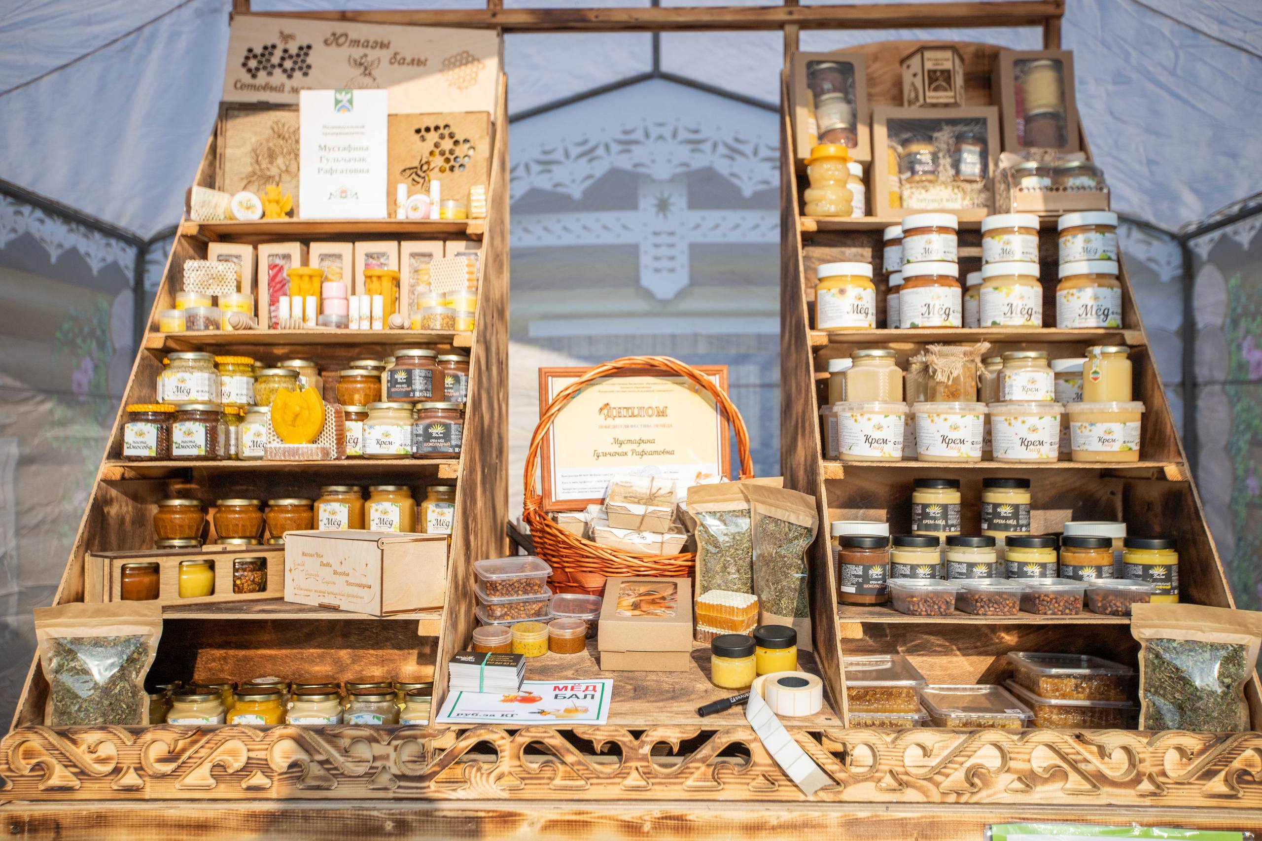 На парковке разместились палатки с мясом, колбасами, молочной продукцией, мёдом, хлебобулочными изделиями, поделками из дерева и одеждой ручной работы для малышей. Фермеры ждут гостей каждую субботу с 8:00 до 14:00.