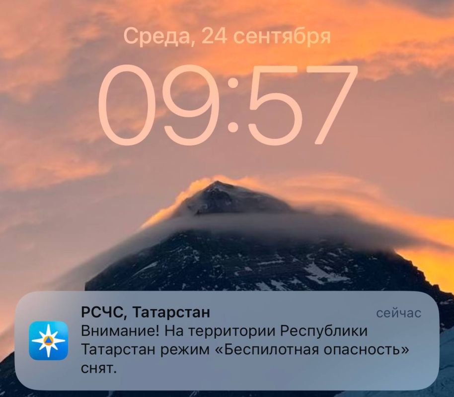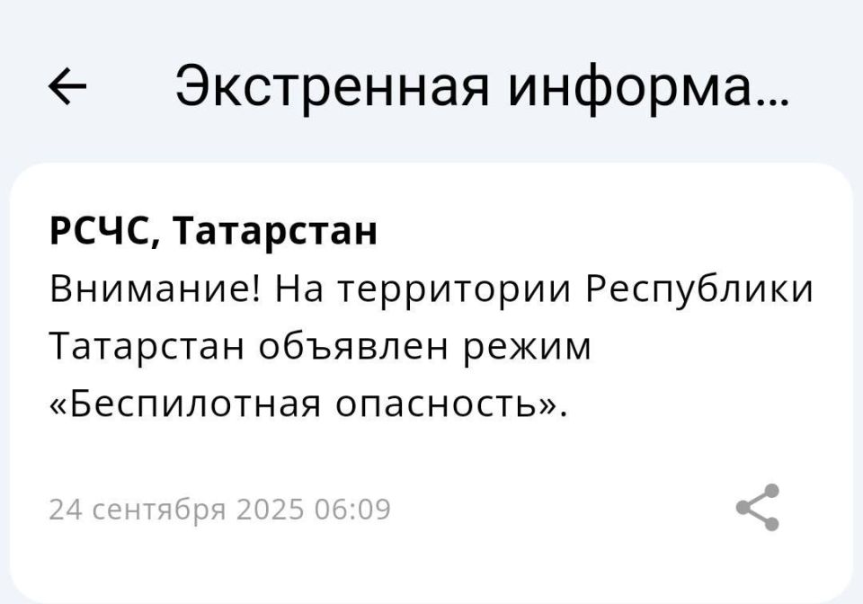 В Татарстане введен режим «Беспилотная опасность», сообщение об этом появилось в приложении МЧС.Ранее режим «Беспилотная опасность» вводили 22 сентября — тогда он продлился свыше 20 часов.Подписаться | Сообщить новость"Вести...