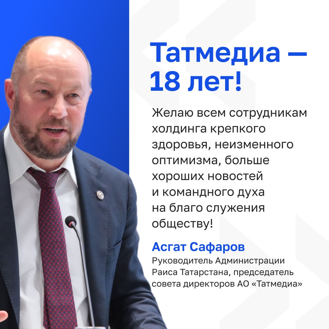 Поздравляю Вас, весь коллектив и ветеранов акционерного общества «ТАТМЕДИА» с 18-летием со дня основания холдинга. Искренняя преданность своему делу, активная гражданская позиция – вот что всегда отличает редакции «ТАТМЕДИА».При этом стратегия холдинга - максимальный охват аудитории. Для этого используются возможности процессов цифровой трансформации: освоение онлайн-среды, производство современного контента, работа в соцсетях, внедрение искусственного интеллекта – все это направлено на поддержание сотрудников в их творческой работе и освобождение от рутинных процессов.