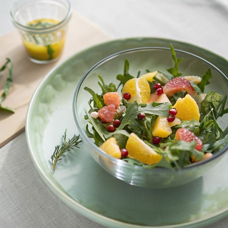 - Ингредиенты: 80 г рукколы, 150 г апельсина, 50 г гранатовых зерен, 70 г авокадо, 10 г оливкового масла, 15 г лимонного сока, соль и перец по вкусу.