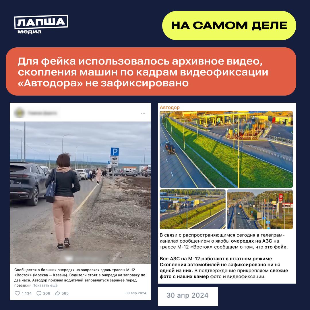 Каналы использовали архивное видео, снятое еще в апреле 2024 года. «Автодор» опроверг информацию о пробках на АЗС на трассе М-12. Реальные кадры на камерах видеофиксации также подтверждают отсутствие очередей на заправках: