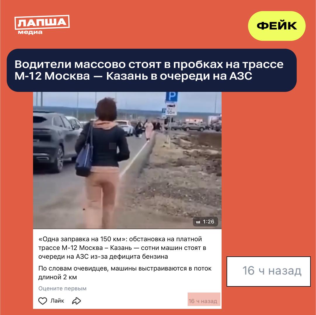 В Сети распространяют видео, якобы водители массово стоят в пробках на платной трассе М-12 (Москва — Казань) из-за очередей на АЗС, вызванных дефицитом топлива.