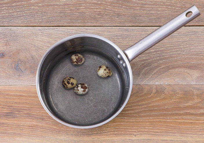 Шаг 1: Вскипятите воду в кастрюле, добавив соль. Поместите перепелиные яйца и варите ровно 6 минут. Затем охладите яйца водой.