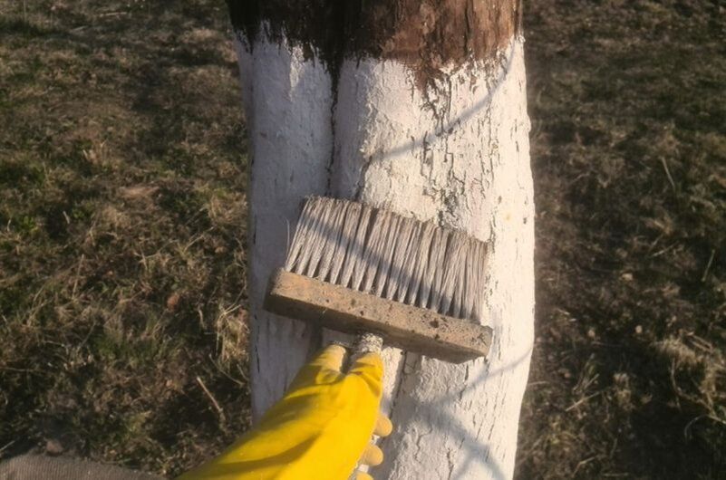 Побелка осуществляется с помощью гашеной извести. Для этого в 10 литрах воды разводится 2 кг извести. При необходимости можно добавить железный купорос для дополнительной защиты стволов от болезней. Такой раствор будет оберегать деревья, отражая солнечные лучи и снижая риск перегрева в зимний период.