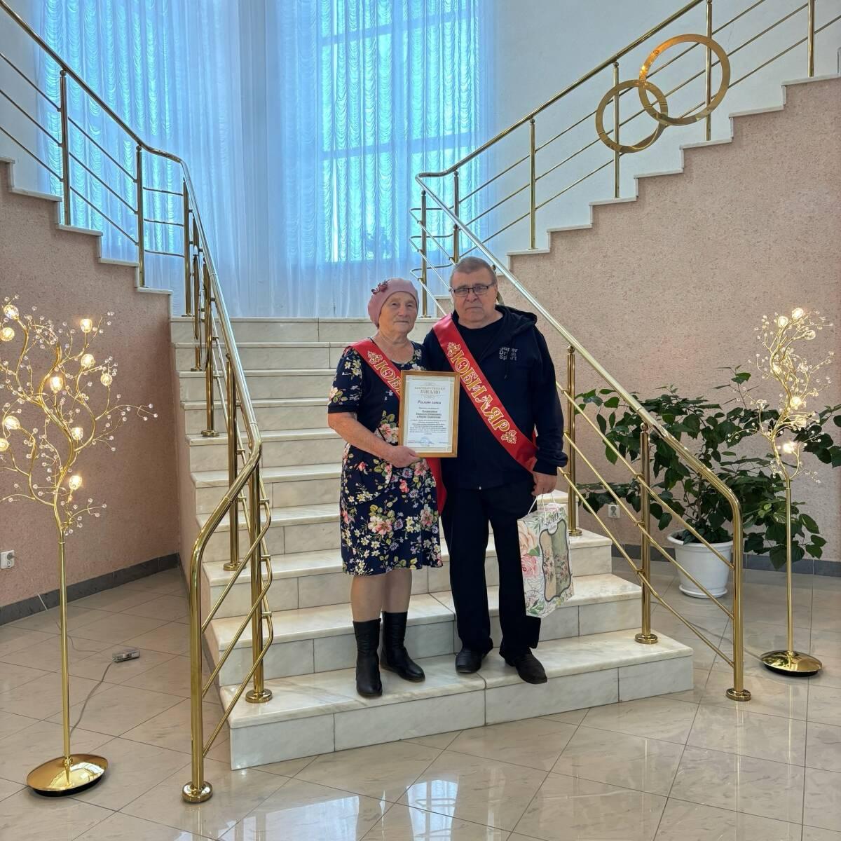 Особую символичность дню придала встреча у дверей Дворца бракосочетания: молодожены пересеклись с «изумрудными» юбилярами. Николай и Нурия Некрасовы отметили в этом году 55-летие совместной жизни.