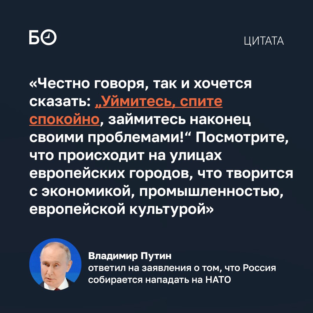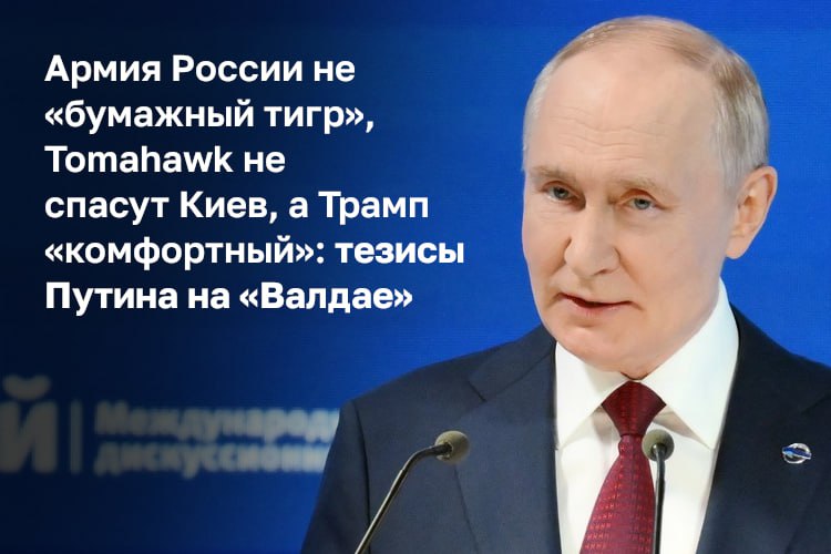 Кроме этого, Путин заявил, что российская армия самая боеспособная в мире, а американские ракеты Tomahawk не помогут Киеву. Как Путин призывал европейцев «уняться», обещал больше не посылать беспилотники в Данию и объяснял повышение НДС, — публикуем главное из выступления президента.