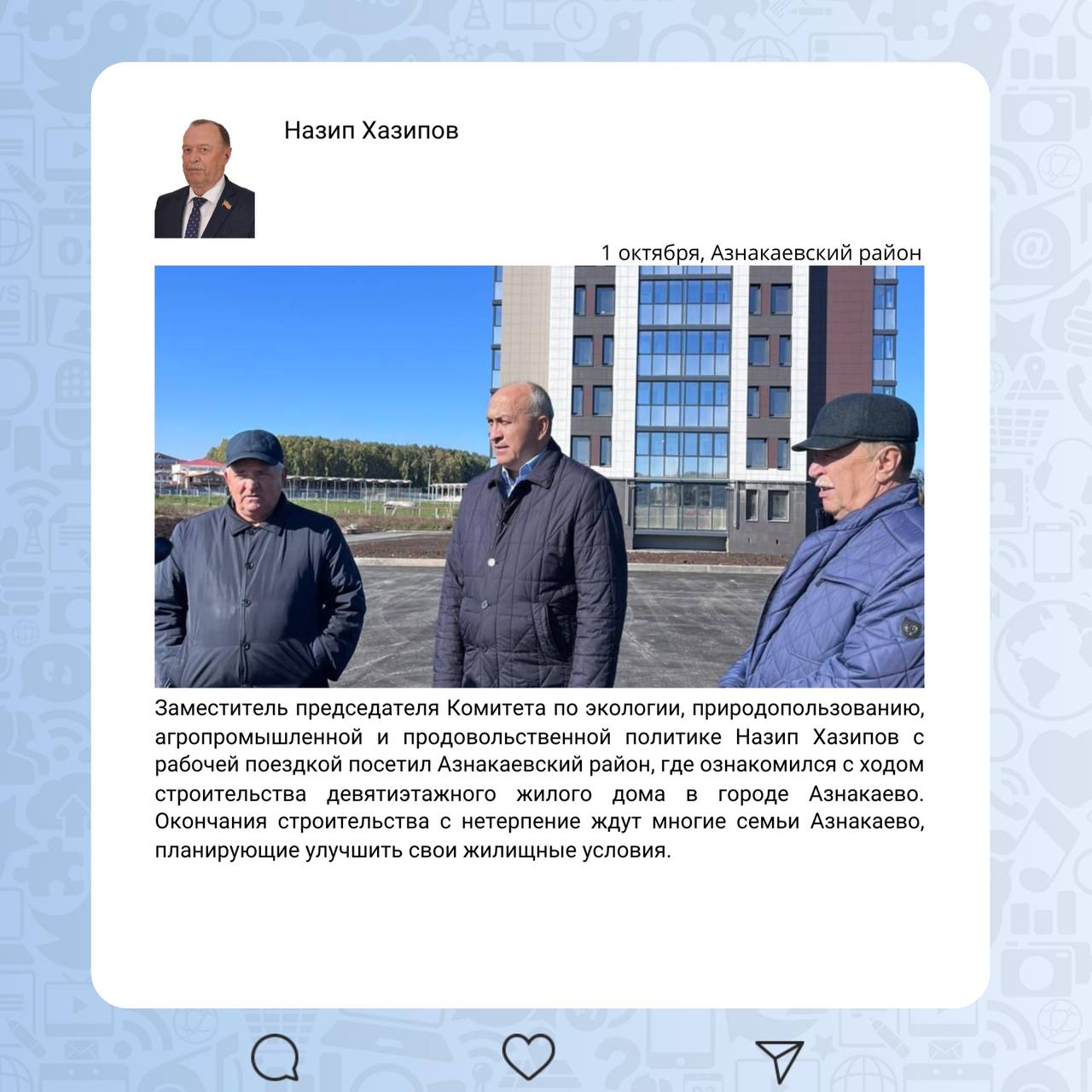 Продолжается работа депутатов в избирательных округах. На этой неделе парламентарии провели прием граждан, вручили паспорта юным татарстанцам, посетили общеобразовательные учреждения в муниципалитетах республики, встретились с педагогами и поздравили их с наступающим Днем учителя.