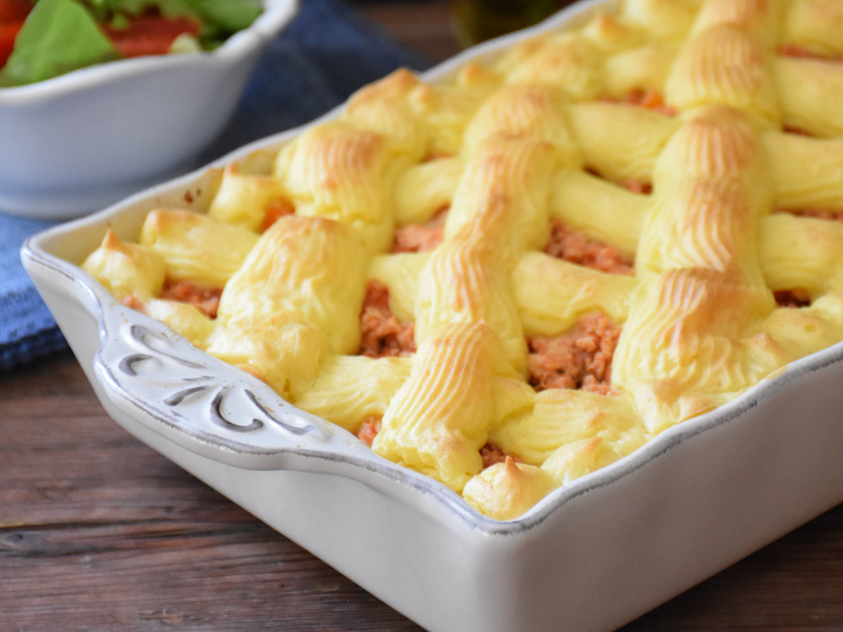 Приходит время сборки! В форму для запекания выкладывается 2/3 картофельного пюре, затем равномерно распределяется слой мясной начинки. Накрывается оставшимся картофельным пюре. Для красивой корочки верх запеканки можно украсить узором с помощью вилки или кондитерского мешка. Щедро смажьте запеканку растопленным сливочным маслом для привлекательной золотистой корочки.