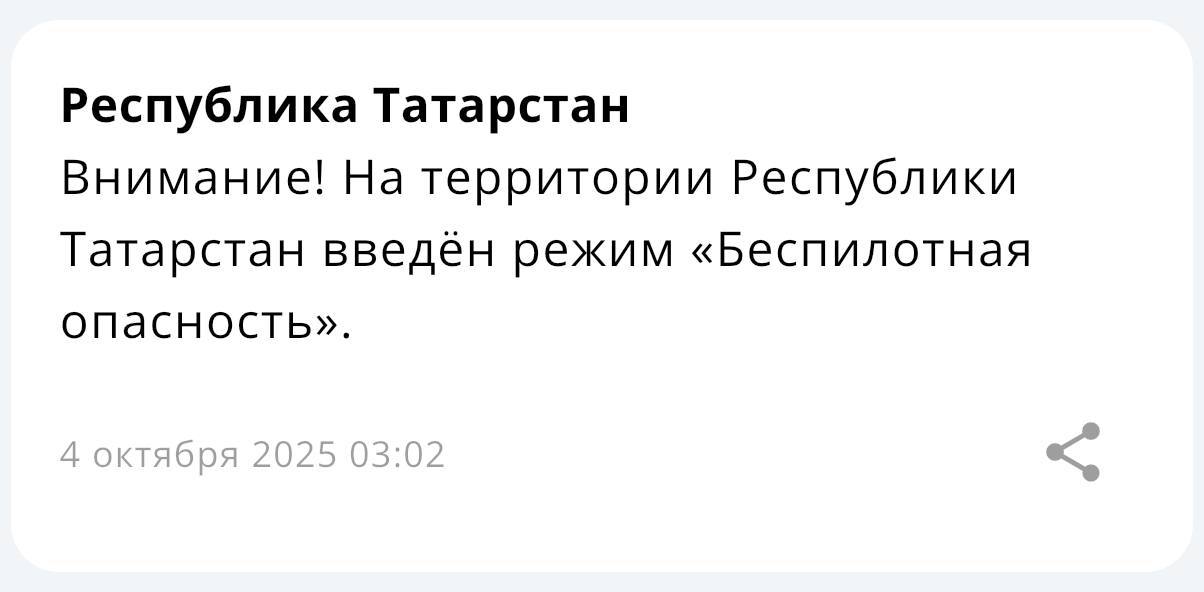 В Татарстане четвертый раз за неделю объявили режим опасности БПЛА. Он действует на территории республики с 3:02, следует из уведомления МЧС.