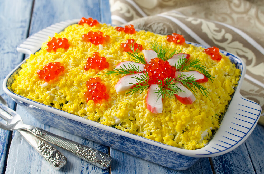 - Салат «Мимоза» — его можно украсить свежими травами и готовить в виде цветов, добавляя цветные овощи для ярких акцентов.