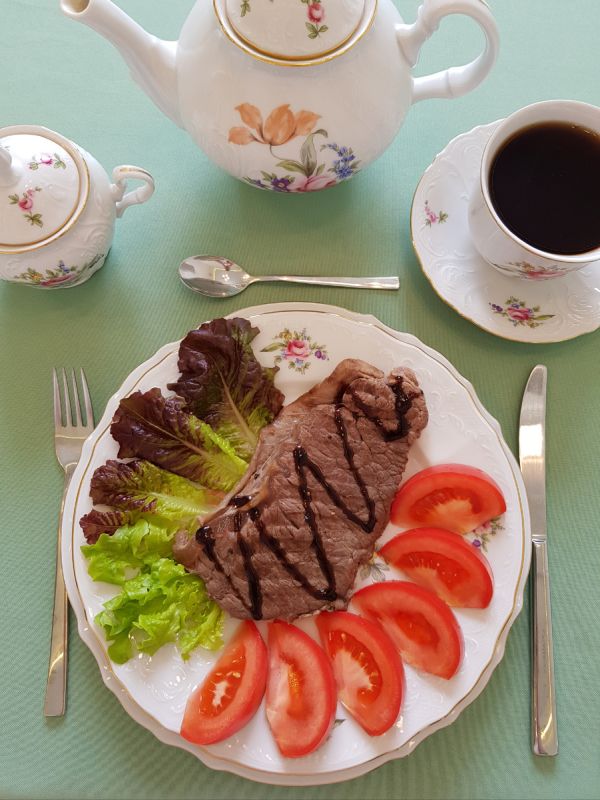 Перед подачей на стол, антрекот можно посыпать морской солью и свежемолотым черным перцем. Не забывайте украсить блюдо бальзамическим соусом, свежими листьями салата и ломтиками помидоров. Прекрасный ужин готов!
