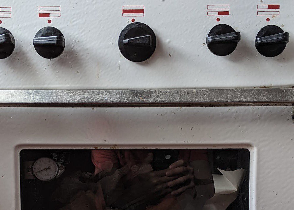 В перчатках протрите стенки духовки влажной губкой, чтобы удалить легко смываемую грязь. Затем нанесите нашатырный спирт на сильные загрязнения с помощью пульверизатора или губки и оставьте на несколько часов. После того, как загрязнения размягчились, смойте их влажной тряпкой и удалите остатки спирта, оставив дверцу открытой для проветривания.
