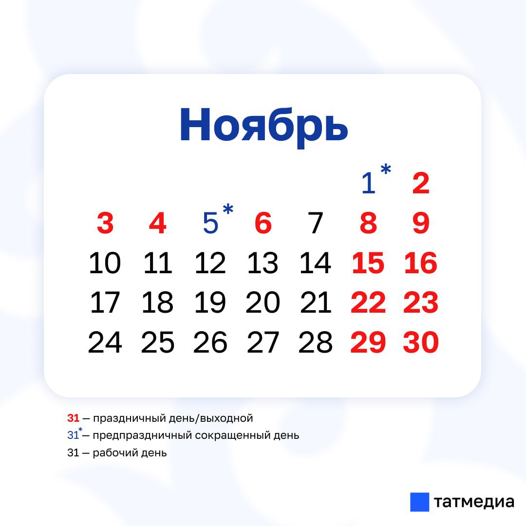 Кроме того, в Татарстане праздничным нерабочим днем станет 6 ноября, в этот день в республике отметят День Конституции РТ.