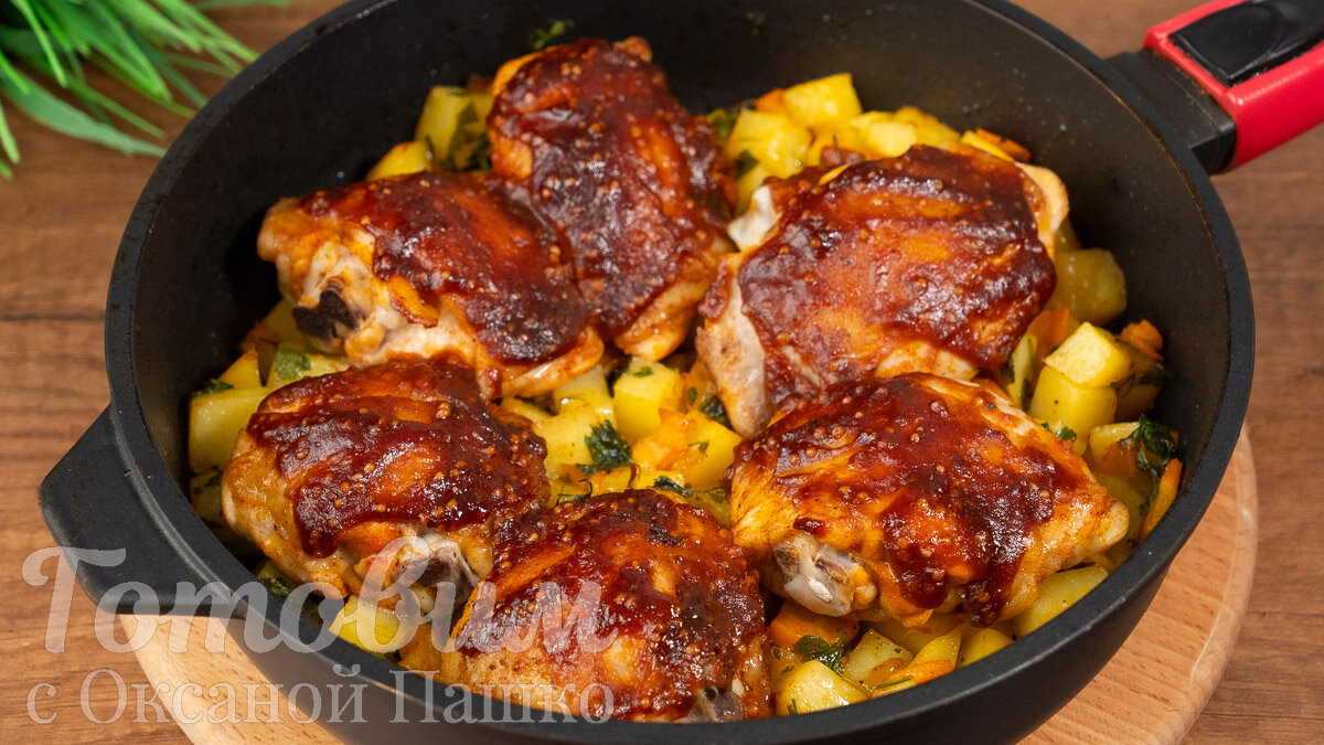 Простой и вкусный рецепт, который займет достойное место в вашем ежедневном меню! Куриные бедрышки, запеченные под нежным кисло-сладким соусом, сочетаются с мягкой картошкой и овощами, создавая идеальное сочетание вкусов. Это блюдо порадует как в будние дни, так и на праздничном столе.