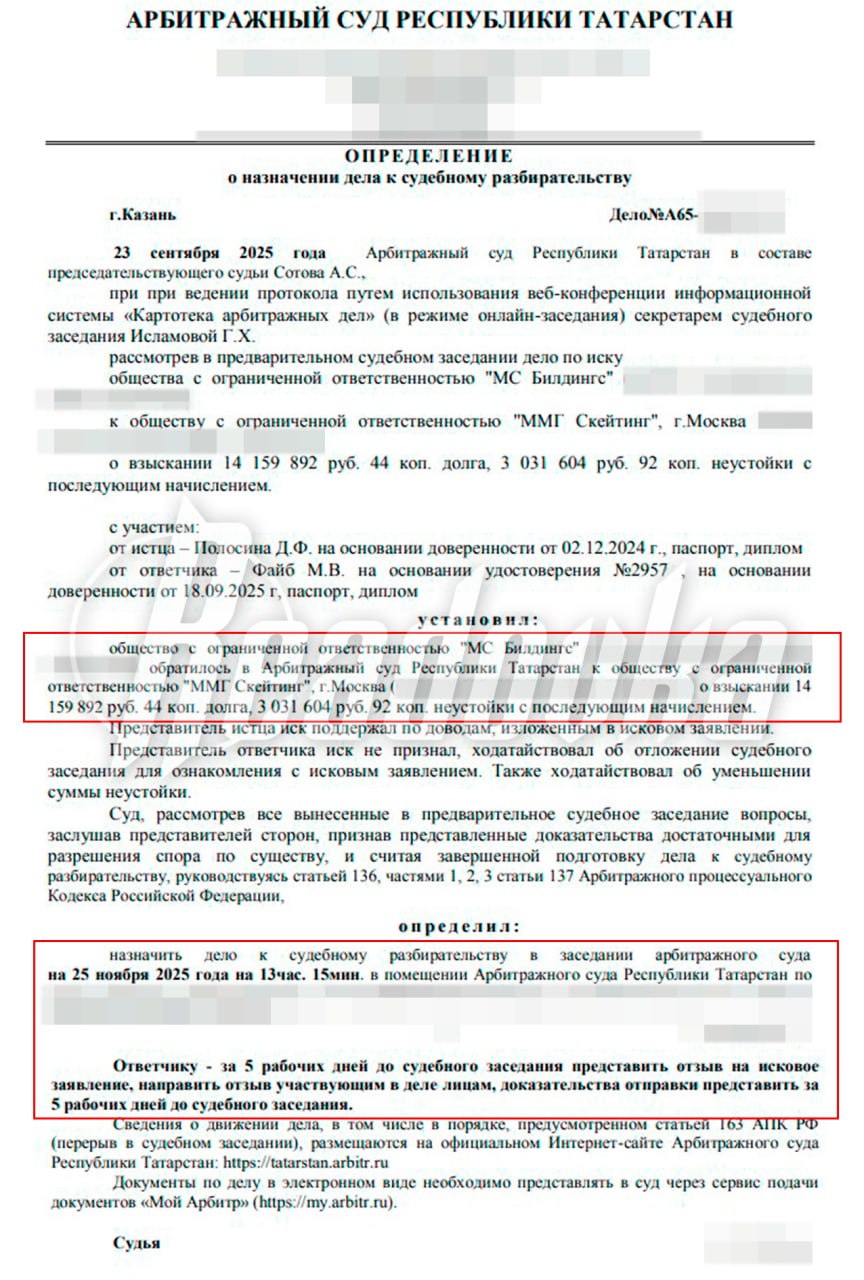 На компанию фигуриста Ильи Авербуха подали иск в суд за то, что та не оплатила выполненные работы. ООО «МС Билдингс» из Набережных Челнов занимается производством ангаров и требует взыскать с фирмы спортсмена ООО «ММГ Скейтинг» 14,1 млн долга и еще 3 млн сверху за неустойку, выяснила Readovka, изучив материалы дела. Поданный иск в августе был принят Арбитражным судом Татарстана.
