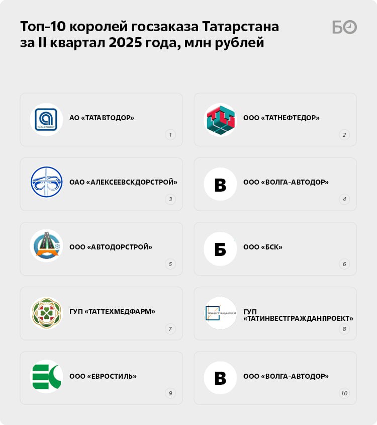 Лидером по объему госзаказов вновь стал «Татавтодор» Айрата Шаймиева, за июль — сентябрь заключивший контрактов почти на 9,3 млрд рублей. Все деньги направлены на ремонт республиканских автодорог. На втором месте — компания Шафагата Тахаутдинова, тройку крупнейших господрядчиков замкнул еще один дорожник — «Алексеевскдорстрой». В топ-5 вошли также «Волга-Автодор» и «Автодорстрой», получившие за квартал 3 и 2,45 млрд рублей соответственно.
