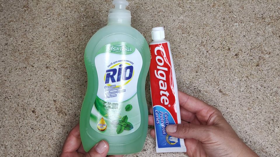 Сначала налейте моющее средство в миску и добавьте к нему зубную пасту. Хорошо перемешайте до образования однородной массы. Затем растворите соду в теплой воде и добавьте в смесь. Продовжайте смешивать, пока все ингредиенты не объединятся в одно целое. Для удобства используйте бутылочку с дозатором, это значительно упростит процесс уборки.