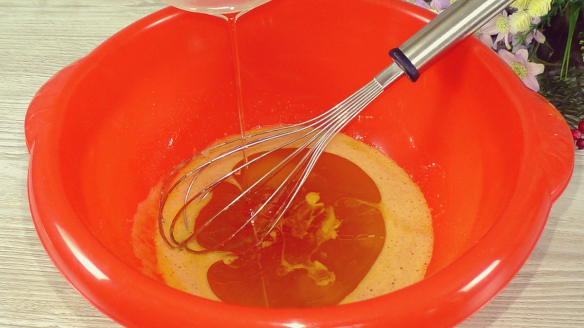 Сначала в глубокой миске тщательно смешивают яйца и белок, добавляют немного соли, сахар и ванилин. Важно, чтобы мед был жидким; если он довольно густой, стоит его немного растопить для удобства.