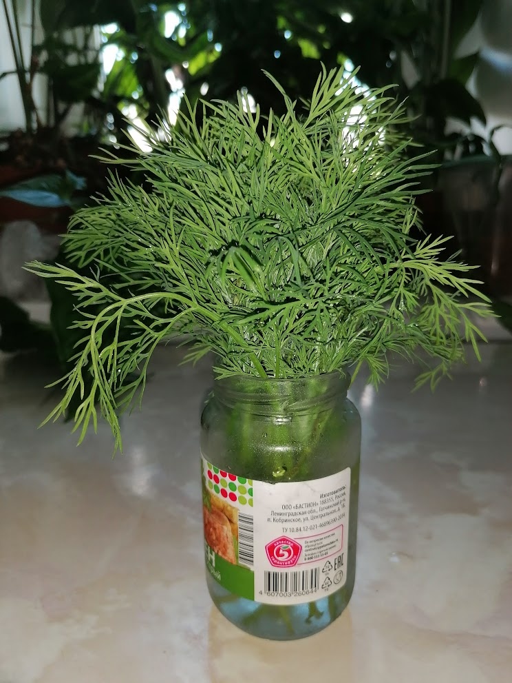 - Зелень в воде. Укроп, петрушку и другие травы стоит хранить в баночке с водой, накрыв пакетом. Это позволит сохранить их свежесть на более длительный срок.