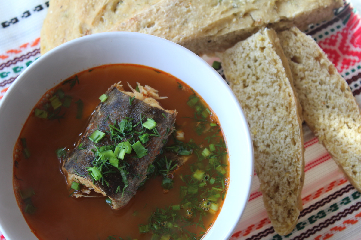 Перед подачей в каждую тарелку укладываются кусочки рыбы, заливаются горячим бульоном и посыпаются свежей зеленью. В сезон можно добавить также нарезанный сладкий болгарский перец для улучшения вкуса.