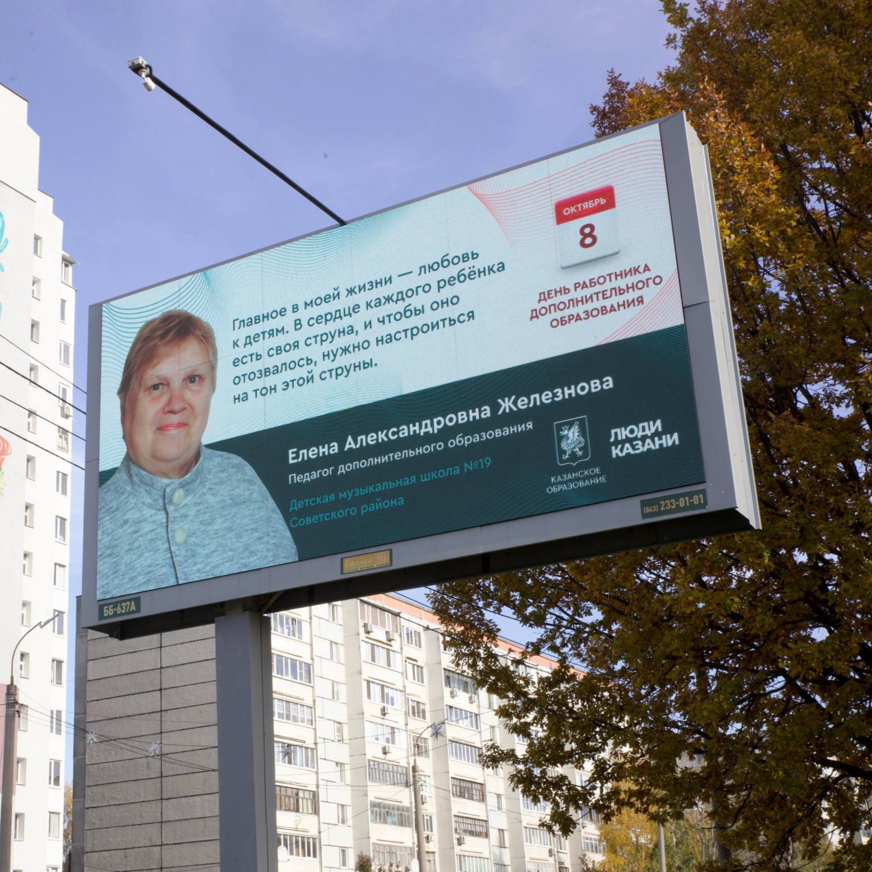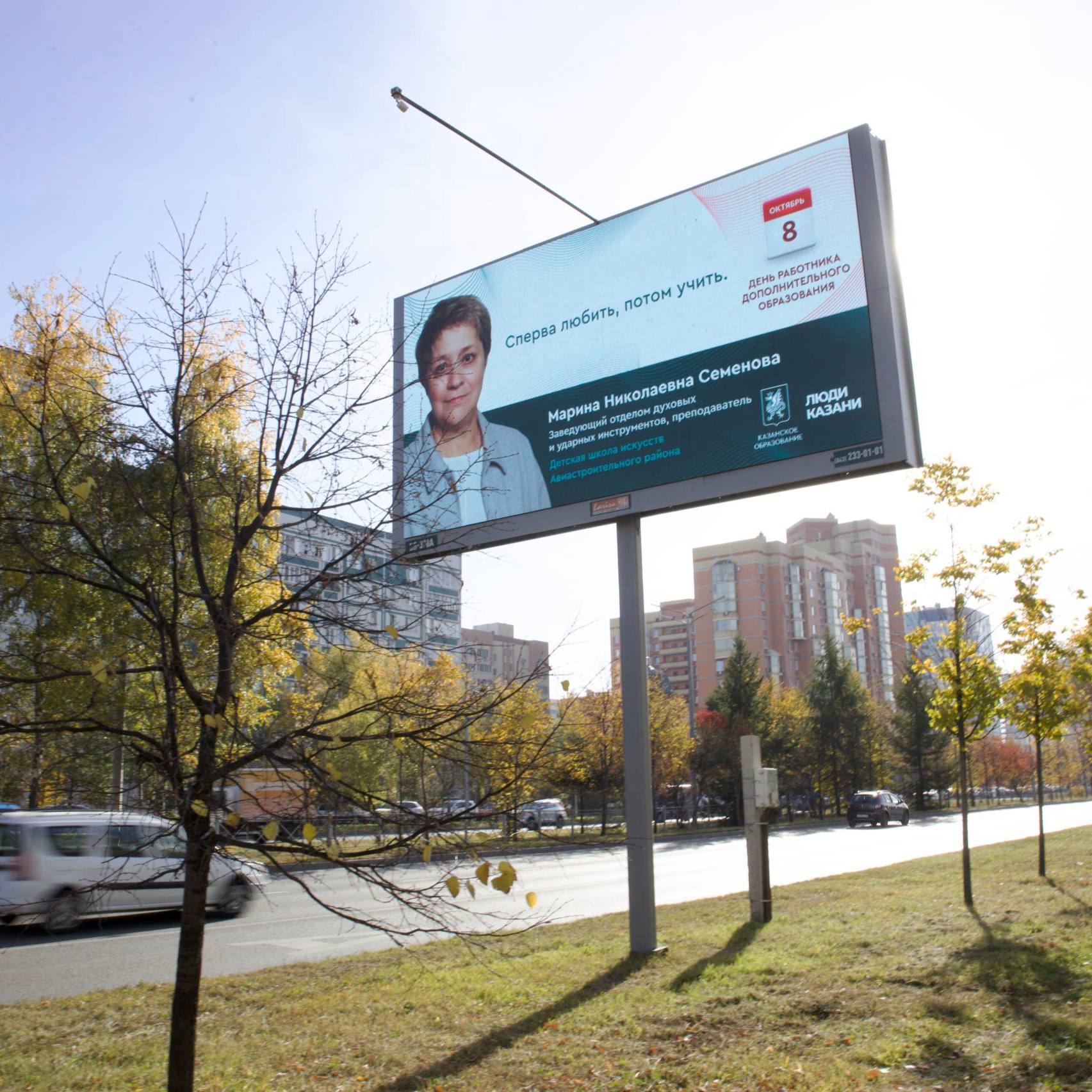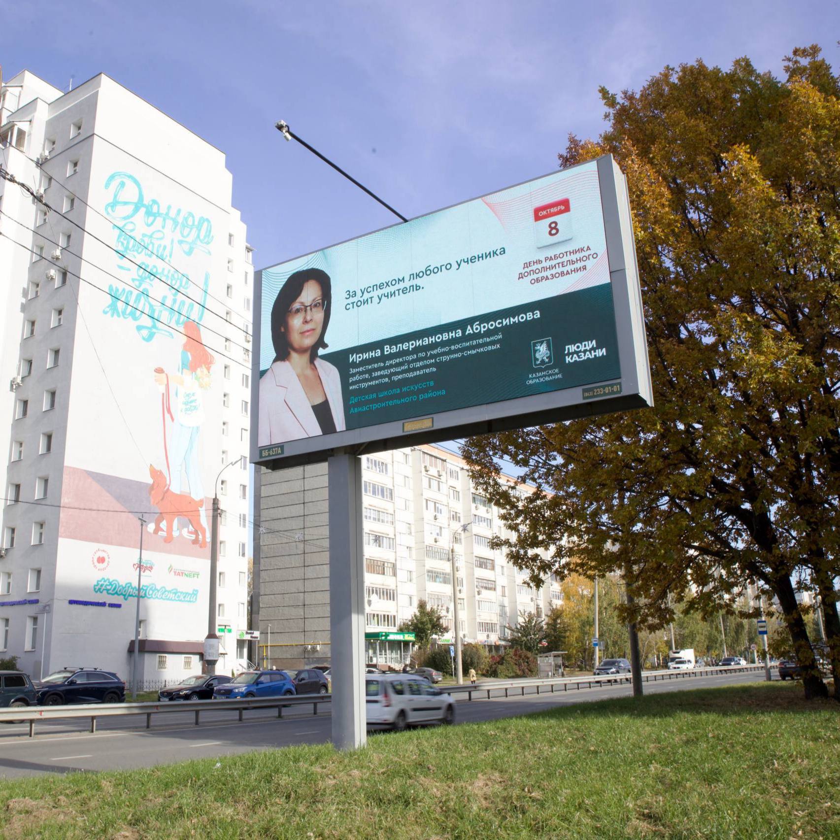 Ко Дню работника дополнительного образования на улицах Казани появились баннеры с портретами педагогов и их цитатами о любимом деле.