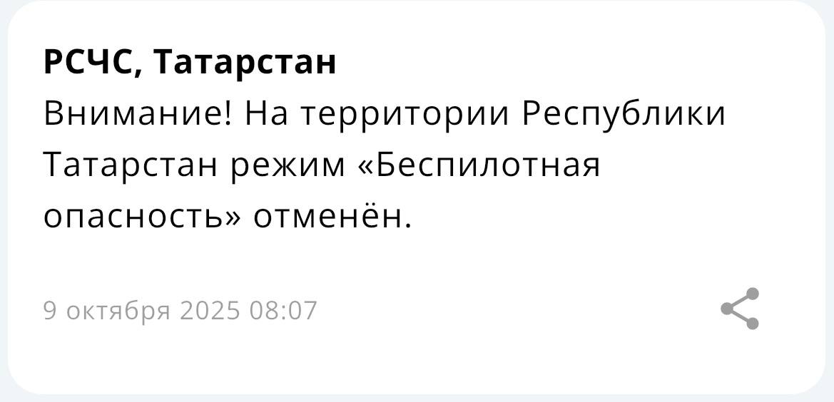В Татарстане снят режим беспилотной опасности, который был введен с 02:43 по московскому времени. Об этом сообщили в официальном приложении МЧС России.