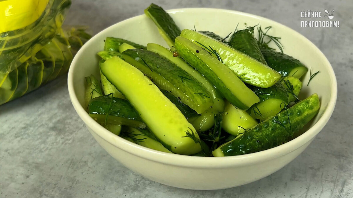 Пакет плотно закрывают, чтобы все ингредиенты равномерно распределились. Оставляют на столе на 3-4 часа — этого времени вполне достаточно, чтобы огурцы пропитались ароматами и стали готовы к употреблению. Если переместить их в холодильник, то они будут готовы к подаче примерно через 8 часов.